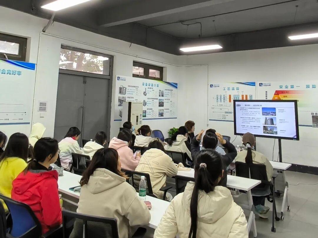 在北苑污水处理厂,师生们接受了严格的安全培训后,在工程师的引导下实地参观了从进水到出水的全流程自动化处理设施。工程师详细讲解了先进的“A²/O+MBR膜过滤+紫外线消毒”工艺原理与运行管理,同学们就工艺效率、污泥资源化、能耗控制等专业问题与工程师和任课教师进行了深入交流。通过亲眼观察污水由浊变清的“变形记”,书本上“活性污泥法”、“膜分离技术”等抽象概念变得直观可感,使同学们深刻理解了污水处理在环境保护与资源循环利用中的关键作用。