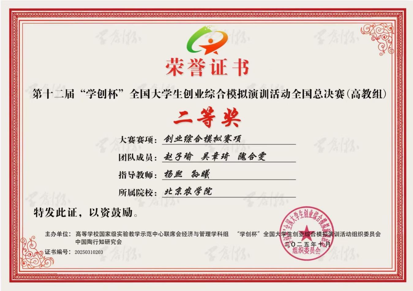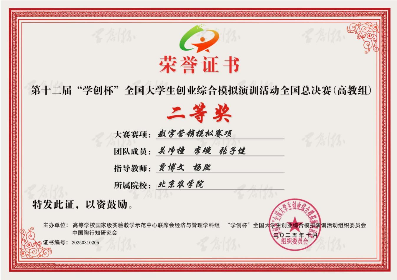 在本次比赛中,国际学院师生表现优异。国际学院2023级农业资源与环境专业本科生李璇与智能科学与工程学院物联网工程专业本科生张子健组成的“值得信赖的”团队、国际学院2023级食品科学与工程专业本科生刘勇良、农业资源与环境专业本科生周赵璇与智能科学与工程学院2022级数据科学与大数据技术专业本科生于俊杰组成的“栗子鱼”团队,在国际学院教师贾博文、杨熙与智能科学与工程学院教师焦鹏的共同指导下,分别荣获数字营销模拟赛项全国二等奖。国际学院2023级农业资源与环境专业本科生赵子瑜、吴章琦和隗合雯组成的“7开得胜”团队,在国际学院教师孙曦、杨熙的悉心指导下,荣获创业综合模拟赛项全国二等奖。