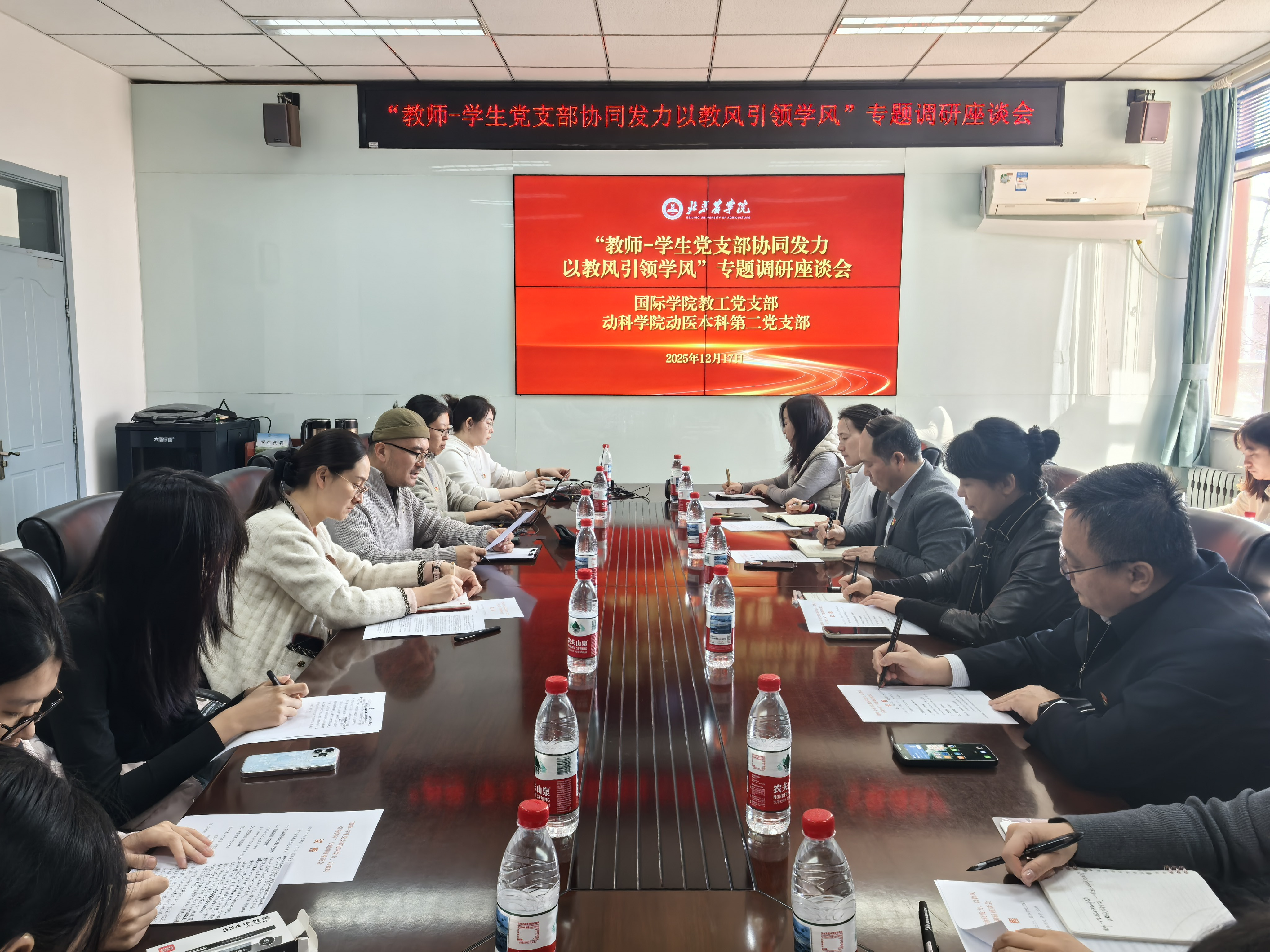 12月17日下午,国际学院教工党支部与动科学院动医本科生第二党支部联合开展主题党日活动,围绕“教师-学生党支部协同发力,以教风引领学风”主题交流座谈。学校党委常委、副院长武艳出席并讲话。国际学院党党总支书记、院长何忠伟,动科学院党委书记党登峰、党委副书记苑婧娴,两个党支部的师生党员和国际学院党外教师代表共20余人参会。活动由国际学院教工党支部书记李宁主持。