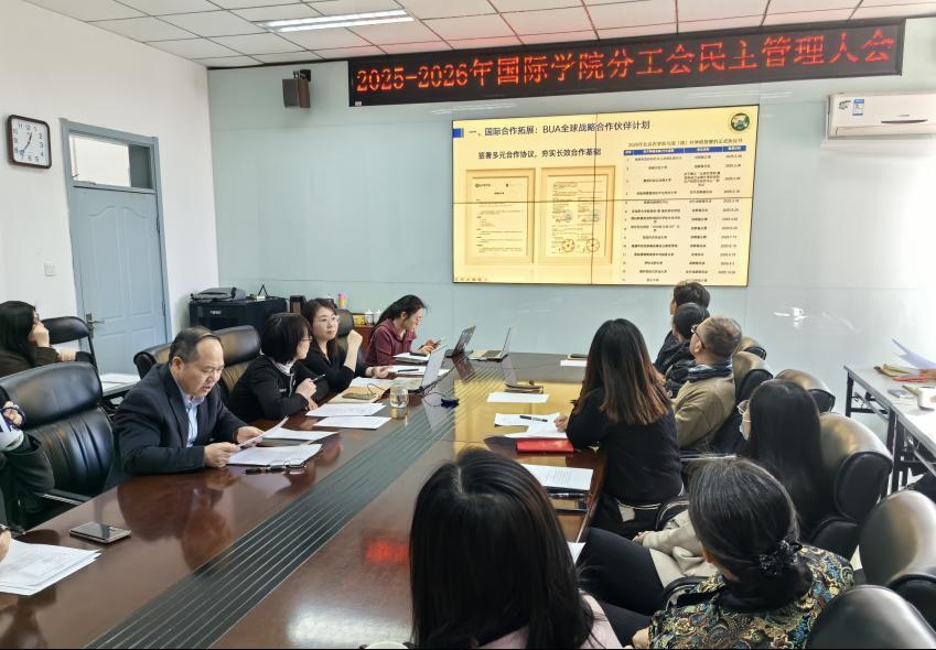 2026年1月21日,国际学院召开2025年度教职工民主管理大会。学院全体教职工参加会议,分工会主席杨熙主持会议。